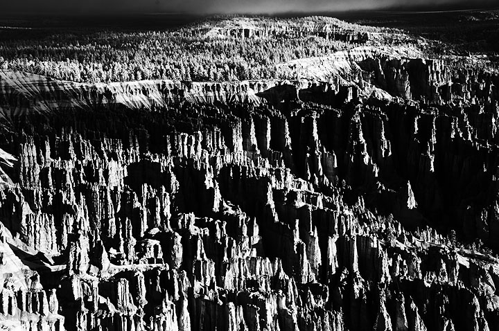 ![]() Dark Forest Near another Scenic Turnout Capitol Reef National Park, Utah ![]() Hoodoo... Bryce Canyon National Park, Utah Nikon D90Infrared, 18-105 kit lens Nov 23. Pacific or Atlantic? ![]() The only thing comes out the pipe of this car is water Which Ocean will you let the water go, is up to you June 2004, Loveland Continental Divide, Colorado. At 11,990 feet above the sea level, the view was breath-taking. But I was more amazed by this little Focus, powered by only hydrogen. I really had to rev my little civic to get this high. The exhaust of the Focus was hydrogen oxide, aka, water. I thought this was dramatic, and sent this image to Ford to see if they would like use it for PR (for free). Unfortunately, at that time, the theme was "Build Ford Tough". What can we help now? Nov 16. Zoo in IR ![]() Giraffe's Latest Hair Style Canon XS, 400 mm @ 1/400 s, f 7.1 One easy way to get rid of stress accumulated in the week, is to walk in a park, as a spectator. Nov 12. How to get a smooth water without a tripod ![]() Weekend Trail Brunch Canon XS, 18-55 IS @ ISO 100, f 22, 0.3 s, mirror lockup camera was pressed against a vertical rock "The camera you have in hand is the best in the world". I bring a camera with me almost all the time. Thus, I accumulated so many photos of hiking in my neighborhood, that I need to find ways to name them. I did not let my "non-photography" friends feel alone. I always pay attention to them, and do not bring much equipment when we need to move fast, and apologize right away for taking much time waiting for the light. Thus, I enjoy many activities with friends, and photography as well. Someone happened to ask me the details of how to get a smooth water in IR, following my recent post. In IR, it will be the similar to color photography: keep everything still, except water. Let the shutter open for a quarter of a second or more. Everything, includes the camera and everything in the viewfinder. If you have a tripod, then it is easy. But sometime, when tripod is not an option, we can rest the camera on anything solid, hiking pole, tree trunk, rock. If the camera has a mirror lockup, please use it. I also like to use a timer (2 second). Some Nikons may not have a mirror lockup, then we can use shutter delay. If you like to include some greens in the scene, then you need to watch for the wind, so that the reeds, branches, grass do not sway. The light. Without sunlight, the IR images will look dull. Too much sunlight, then it is hard to have long shutter speed. To get long shutter speed, we need to set the ISO to the lowest, use a small aperture, and maybe put on a circular polarizer filter. I also like to use AEB. Normally, I will bracket for 3 frames, 0.7 stop. Wait a little to let the light shine on the subjects that are interest to you. Happy shooting, and enjoying other things! Do not get too involved into it, when with friends! ![]() Which way, if on foot? Canon XS, 18-55 IS @ ISO auto (320), f 9, 1/50 s my hiking snapshot (in case get lost) Nov 7. Why Tungsten Bulb Burn an Infrared Study ![]() Top: regular Nikon D50 color photo (your eyes see) Bottom: Nikon D50IR infrared photo (your eyes can not see) Both shot at ISO 200, f 13, 1/4000 s Three bulbs are (from left) 27 W CFL, 30 W tungsten, 100 W tungsten Invented more than one hundred years ago, the tungsten light bulb light our modern history. However, these bulbs emit more heat than light. Form the above regular color photo, we can see that a 27 W CFL is as bright as a 100 W tungsten. Why? Because it emits far less IR light than the 30 W and 100 W tungsten! It will be even better, if we could use LED lights (the one used in the newest Apple Cinema Display). Waste not, want not. Even electricity from solar panel is not free: it already took a lot of energy to make! Please reduce, reuse, recycle. Turn off lights when leave the room, turn off the TV when not watch. Good for your bank account, and good for Pachamama. Thank you! Nov 5, Zion N.P. Each year, at the end of October, there is a fall color "fireworks" show. I brought couple of Zeiss lenses, try to get the most of the color. So far, the most often used, however, is the hiking outfit 17-40 and 70-200 f4L.